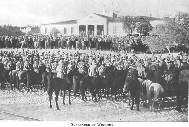 When Windhuk surrendered, not many able-bodied men were in the place; but there were a great number of women and children, mostly belonging to the poorer classes, who had come in from distant parts when the Union troops approached, or who feared to remain on the farms after their men-folk had left. Altogether there were about 3,000 young children in the place besides grown-ups, and the bulk of them were very badly off for provisions, and had to be fed by the Union Government. We were told that only those civilians who could provide themselves with three months' rations were allowed to retire north to Otavi and Grootfontein, which explains why so many people were left at Windhuk.