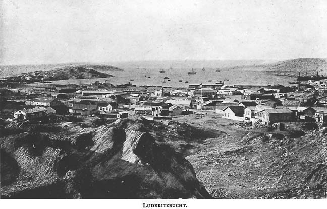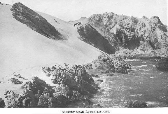 July 18.---I don't suppose there is a more desolate, dreary, God-forsaken site for a town in the whole world than this, and nobody except extreme optimists like the Germans would ever have dreamed of trying to establish one here. There is not a drop of fresh water anywhere near, nor a plant nor tree of any description except seaweed. There is not even a flat space where buildings can be erected, and many are perched on pinnacles or in fissures in the rocks. Its only natural advantages are the sun, sea, rocks, sand, and wind. The town is at the foot of a great tumbled mass of volcanic rock which juts northward into the sea, and this mass is obviously continued in three islands with small shallow channels between them. In this way a bay is produced. Dias, who visited the place, but did not stay, called it Angra dos Ilheos---the Bay of Islets. Later it was renamed Angra Pequeña---Little Bay. Finally the Germans changed the name to Luderitzbucht, after an explorer of theirs, Luderitz by name. All the rocks about are of the dull grey colour of pumice, and everything, including sea and sky, seems to reflect the same leaden hue.