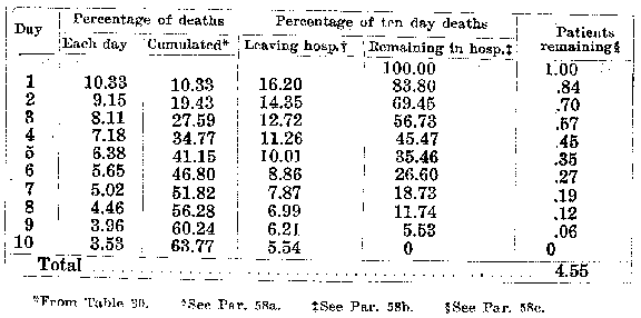 59. Patients in hospital on the maximal day. As stated above, among gassed cases who eventually die and for whom the duration of treatment is from one to ten days, there are 4.55 cases in hospital on the tenth day, when the daily admission rate from such cases is 1.00 per day.